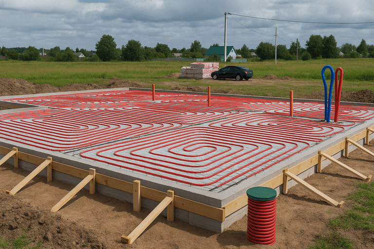 Перед армированием укладываются трубы канализации, водоснабжения и другие коммуникации с выводами под дом. - Монтаж опалубки и утепление